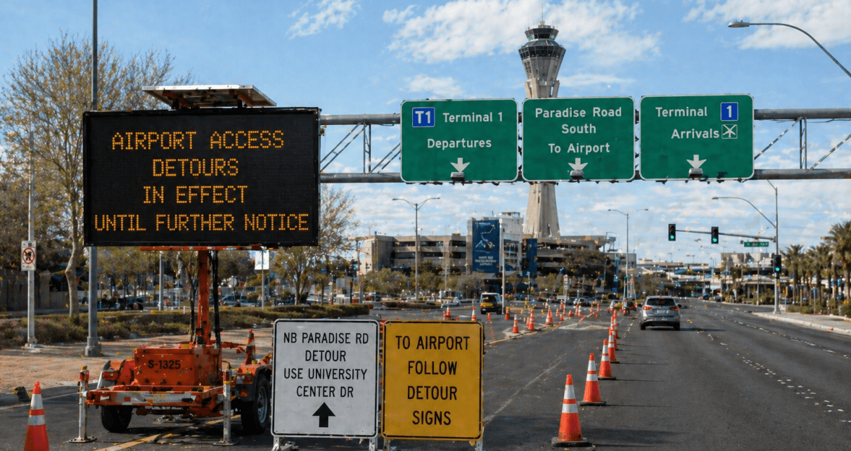 Significant infrastructure projects have triggered continuous detours affecting major arteries surrounding Harry Reid International Airport. These changes began at 3:00 AM on Thursday, April 30, and are listed as “until further notice”: